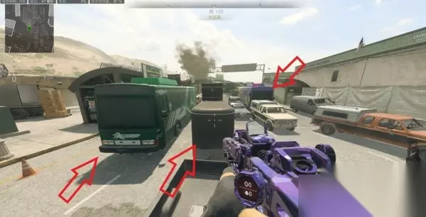 同一个站位不同的打击点,在这架枪打标点处敌人更有优势,缺点是容易被背后或右侧图一处敌人偷袭,所以依战场局势,自行切换不同站位,推荐灵活走位,每个点位都观察几秒然后切换,注意观察敌人复活点,哪里经常走人就看哪里,此处也是推荐热成像配烟雾弹口感更佳,如下图所示
