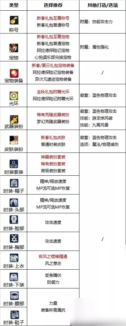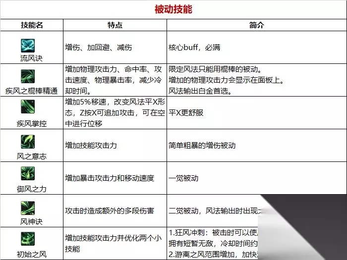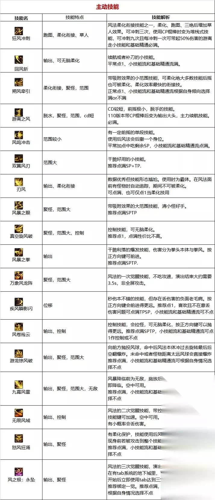 职业优劣势分析: 【优点】 强续航(CP武器)、技能范围大、高机动性,易上手。 【缺点】 虽然易上手,但是CP武器的存在还是要求玩家有一定的操作手法——使用冲刺时能在怪物周围快速地左右横跳、横跳期间会插入其他技能。玩家的操作水准很大程度地影响CP武器的发挥。 当前的强度过于依赖装备。部分玩家可能会因为觉得CP风法的输出模式无聊或不喜欢CP风法偏续航的输出形态而转为制式风法,不过制式虽简单粗暴,但是强度太普通了,二者差距很大。 【大神点评】 技能范围大,拥有柔化机制和草人替身,灵活的快乐风男。 装备相性: 穿戴CP棍棒的风法可以走小技能流派,且目前小技能风法的强度非常在线。 入坑建议:①针对搬砖刮痧(大天御玩家): 风法本身数据一般,低打造风法走爆发行不通。另一方面,低打造时期风法三速低,冲刺都不顺畅,所以这段时期走爆发还是续航都很鸡肋。 个人建议这段时间使用大天域过渡,风法技能范围大,配合CP武器,还是很容易触发大天域特效的。 ②针对中配自强(巴卡妮回廊单刷玩家): 因为这版本风法比较吃版本红利,仅需稍微投入一点打造后风法的可玩性与游戏体验就会上来了,配合空血流单刷方面会相对舒服。 三速方面建议攻速至少实战能到100,再低手感就不好了。 ③针对团本扛把子(红10甚至更高打造玩家): 风法目前的强度是CP棍与小技能相关装备带来的,所以若要追求高伤害,需要练习一下冲刺的快速左右横移以及在其中插入其余技能,手法到位了,加上愿意投入比较多资源打造风法的话,游戏体验会非常不错。 技能加点和护石 1.常见玩法心得 上buff(流风诀),吃药剂,注意装备是否触发 ①佩戴有手搓词条的恩特肩时,需要保证全程手搓游离,这样冲刺游离才能够吃到手搓词条的加成。 ②风法可以无脑柔化的技能:回风斩、真空旋风破、风卷残云。部分技能因为攻速问题目前几乎不可能被柔化掉。风鸣、双翼、风拳、瞬影闪需要掌握一定的柔化节奏。95有柔化保护,不确定在何时柔化时可以在使用该技能后立马狂摁柔化衔接技(朔风、冲刺和刃风)进行柔化。 ③作为追踪类技能,在背对怪物的时候刃风与游龙(带护石)依旧可以释放,可以运用这两个技能调整身位。 ④风法二段跳后,在空中释放一次魔球连射后即可再起跳一次,把握好节奏可长时间滞空。 ⑤面对冰龙的冰柱,风法可以依靠冲刺与瞬移快速通过(其他体积不大的障碍物同理)。 2.加点 CP武器