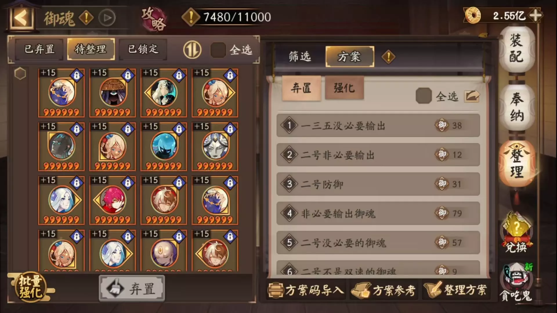 纠错:中高练度强化方案第六条关于防御的,请将星级只勾选6星,等级只选0-2。直接用我发在评论区的图也可以,是最新修改的版本。(已经检查很多遍但还是出了一点问题对不起大家) 本方案比较适合Pve玩家,少部分常用的斗技御魂也会包含在内,但不适合只玩斗技不玩副本的小宝。 因为某些特殊斗技御魂没有保留,并且大量副本御魂对这类玩家来说是没有用的。 副本玩家可以放心弃置,咱方案还是相对保守的~