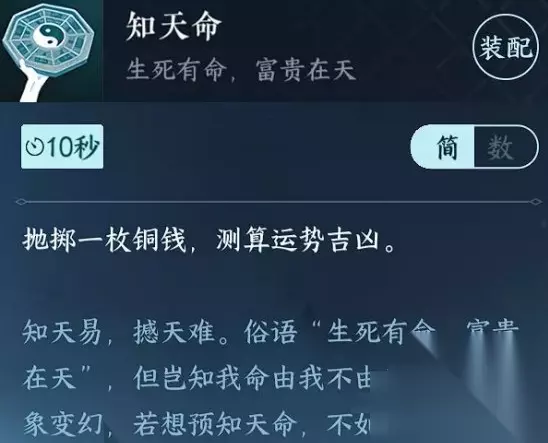 逆水寒手游玄学技能知天命用法详解 获取位置:前往汴京(1329,909),与球形仪对话,摸一下球体后,进入星罗盘挑战,完成小游戏后打开宝箱,获得技能“知天命”。 用法详解:知天命是一个测算运势吉凶的趣味技能,虽然我个人认为与福佑柔泽这类直接加幸运值的技能相比,卜算天机和知天命这些技能都属于玄学技能,但是宁可信其有,不可信其无。
