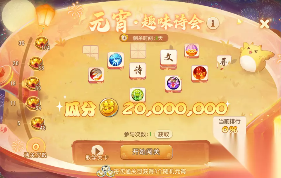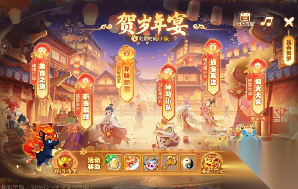 ※ 特别说明:春节活动新增日历提醒功能,少侠可选择开启日历提醒,不再错过春节重要活动。 1. 年兽王挑战: 年兽王再度来袭,每日成功挑战年兽王可获得大量福马通宝。击败★/★★泡泡可提升星级 ,击败★★★泡泡会溅射四周,触发连锁反应并获得增益。通过日常活动获得福马爆竹,可直接提升泡泡星级或引爆泡泡 。巧妙形成连锁爆炸,击退年兽王吧! 2. 元宵趣味诗会: 今年元夜时,月与灯依旧。2月25日12:00(部分服务器2月25日10:00)起,长安将举办一场趣味诗会,通过趣味三消,消除上层的牌堆,找到隐藏在牌堆中的诗文牌。找齐诗文字牌后拖动字序还原诗句,成功通关就能参与瓜分海量金币和银币奖励,累计通关还可以获得福马通宝。
