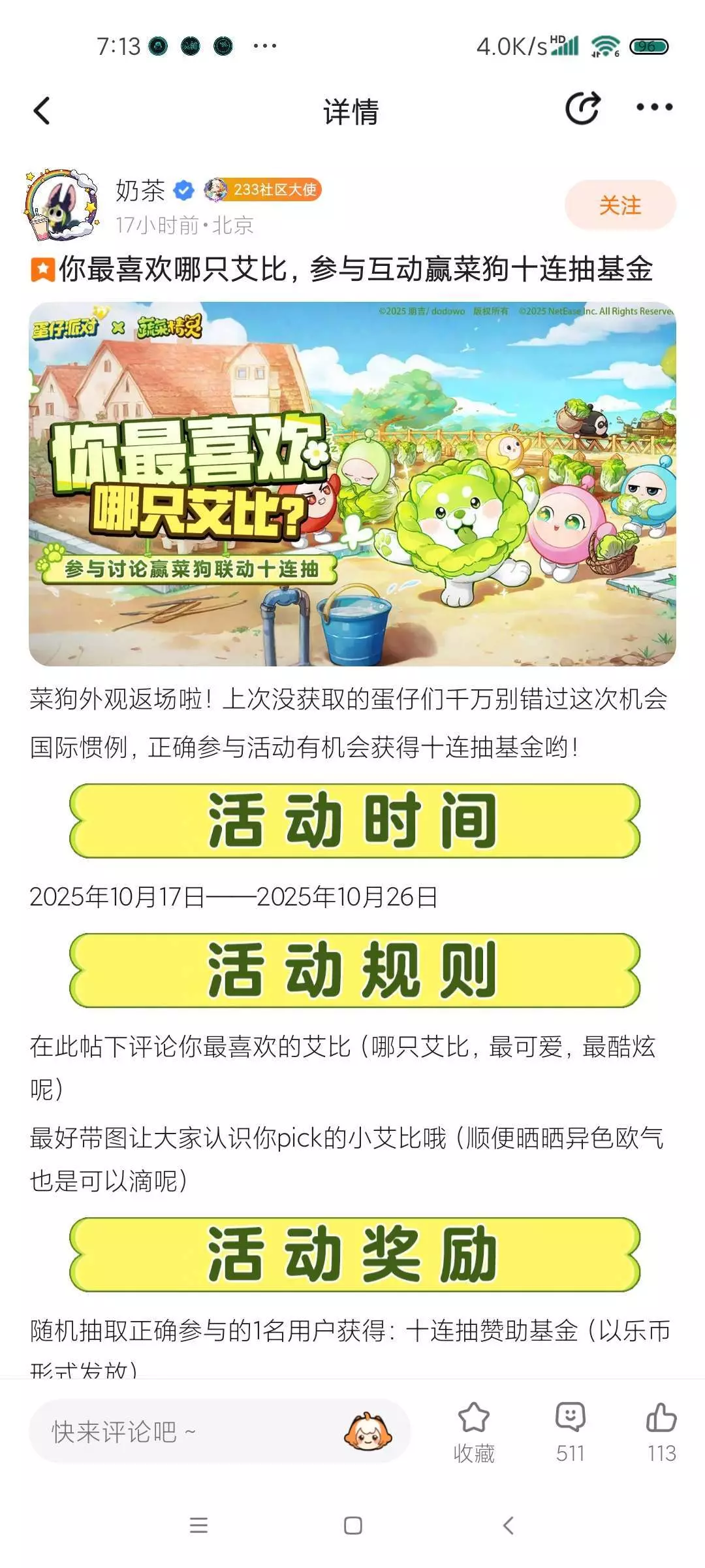 #种草吧玩家 蛋仔派对和多款游戏联动过,目前正在返场的有菜狗,登录做任务免费领取菜狗种子20,还有两款表情包和动作,菜狗返场也包括艾琳,还有小绿都被返场皮肤了,所以屏幕前的家蛋们,你是爱玩惊魂夜还是超燃竞技场呢,可以发在评论区一起聊一聊。
