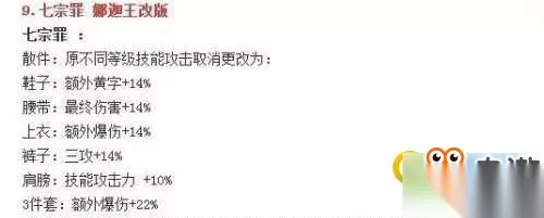 首先我们还是放出娜迦王在本次改版的核心变化. 上衣:整体3%附加提升,存在冲突,对于乌尔班毕业党,提升是较微,附加属性到技能攻击力的提升,约4%,上衣提升(对于绝大多数11、12强化党,6%) 护肩:直观提升3% 腰:伪装删除,和移动速度的增加基本上扯平,对于卢克是坏事,对于安图恩僵尸火山等图是好事,流畅度改变不可量化,力量智力的提升考虑到部分职业武器(攻城炮)上的冲突(提升在9-12) 全套暴击阉割15%,非满暴党(总有人要低估暴击重要性)这里我们就只给做削弱3%保守估计 属性强化25克扣,对于未来的王座版本考虑,较伤,考虑削弱8-10% 整套提升:10%左右 2、七宗罪跨甲第一?