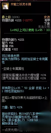 物理防御力 +977 智力 +45 精神 +45 抗魔值 +322 所有属性强化 +12 攻击时,额外增加10%的伤害增加量 施放技能时,有20%的几率使所有队员增加500点HP最大值,效果持续60秒。(最多叠加1次,冷却时间10秒,解除装备后效果消失) 圣骑士(男/女)装备时 [守护恩赐]体力、精神 +156 [启示 : 圣歌]智力 +156 95史诗布甲木魅之祈灵长裤属性: