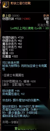 物理防御力 +488 物理攻击力 +62 魔法攻击力 +62 独立攻击力 +62 智力 +33 精神 +33 抗魔值 +322 所有属性强化 +12 物品栏负重上限 +3kg 攻击时,额外增加5%的伤害增加量 施放技能时,有20%的几率使所有队员增加500点MP最大值,效果持续60秒。(最多叠加1次,冷却时间10秒,解除装备后效果消失) 圣骑士(男/女)装备时 [荣誉祝福]独立攻击力增加量 +13% [勇气祝福]独立攻击力增加量 +13% 95史诗布甲野衾之潜行短靴属性: