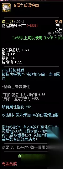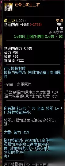 物理防御力 +1465 智力 +56 精神 +56 抗魔值 +322 所有职业75-85技能Lv +1(特性技能除外) 力量、智力 +12% 施放技能时,有20%的几率使所有队员增加3%的攻击速度和5%的施放速度,效果持续60秒。(最多叠加1次,冷却时间10秒,解除装备后效果消失) 圣骑士(男/女)装备时 [荣誉祝福]物理攻击力增加量 +13% [勇气祝福]物理攻击力增加量 +13% 95史诗布甲鸣屋之低语护肩属性: