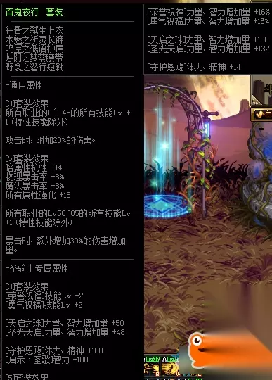 3件套 所有职业1-48技能Lv +1(特性技能除外) 攻击时,附加20%的伤害 5件套 暗属性抗性 +14 物理暴击率 +8% 魔法暴击率 +8% 所有属性强化 +18 所有职业50-85技能Lv +1(特性技能除外) 暴击时,额外增加30%的伤害增加量 所有职业使用85技能时使全部敌人减少44点力量、智力、体力、精神 圣骑士(男/女)装备时 [3]套装效果 [荣誉祝福]技能Lv +2 [勇气祝福]技能Lv +2 [天启之珠]力量、智力增加量 +50 [圣光天启]]力量、智力增加量 +48 [守护恩赐]体力、精神 +100 [启示 : 圣歌]智力 +100 [5]套装效果 [荣誉祝福]力量、智力增加量 +16% [勇气祝福]力量、智力增加量 +16% [天启之珠力量、智力增加量 +138 [圣光天启]力量、智力增加量 +132 [守护恩赐]体力、精神增加量 +140 [启示 : 圣歌]智力 +225 小编点评: 95级的史诗防具各种甲类都有两套。 一套是可以从90B升级而成的泰波尔斯套,另一套是95地下城深渊直接爆的。 这套百鬼夜行是哈林95史诗布甲套,虽然比不上泰波尔斯,但也是很不错的。 看了上文233乐园小编带来的《DNF》95级史诗布甲套百鬼夜行介绍,你是否了解了相关内容信息,知道了呢!更多最新最好玩的手机游戏就来233乐园下载吧! DNF2020活动 欲望之塔