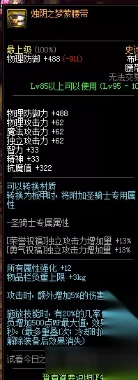 物理防御力 +1221 智力 +56 精神 +56 抗魔值 +322 所有职业35-50技能Lv +1(特性技能除外) 力量、智力 +12% 施放技能时,有20%的几率使所有队员增加8点暗属性抗性,效果持续60秒。(最多叠加1次,冷却时间10秒,解除装备后效果消失) 圣骑士(男/女)装备时 [荣誉祝福]魔法攻击力增加量 +13% [勇气祝福]魔法攻击力增加量 +13% 95史诗布甲烛阴之梦萦腰带属性: