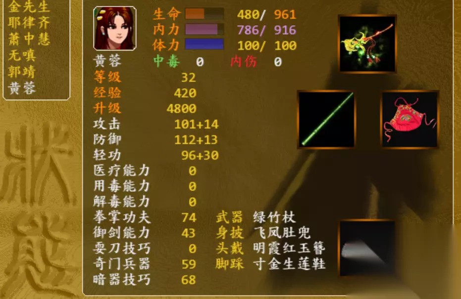 五、淑女套装: 隐藏属性:负面状态免疫(仅女性可用) 组成部位和获得方式: 头盔:红玉簪,在孔八拉的第四项技能开启后可在主角家的后院进行打造。飞凤肚兜:灵鹫宫战李秋水(坚持十回合不败,有几率获得,可反复读档)存金盛莲鞋:当书剑恩仇录剧情完成后,去西夏大战李秋水(有几率获得,可反复读档)