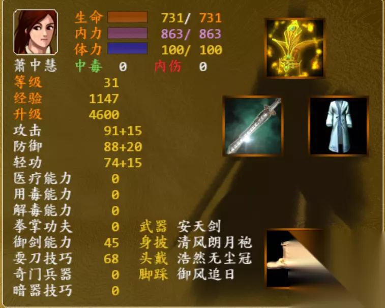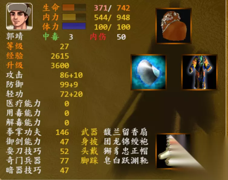 二、学士套装: 隐藏属性:资质提升至100。(前期主角资质比较低,因为低资质在升级过程中,血量增加的比较多。后期配备学士套装后,资质增加后学习各项武功比较快。) 组成部位和获得方式:武器:馥兰留香扇( 封穴几率增加),孔八拉的第四项技能开启后可在主角家的后院进行打造(需要铁骨扇、瀚海玉)。鞋子:皂白跃渊靴,开局即可在洛阳宝箱获得衣服:围龙锦绶袍,侠客行剧情进行到击败长乐帮一众后,去福州击败石青夫妇(有几率获得,可以重复读档)头盔:獬豸忠正帽,阿丑的第五项技能开启后,在开封商店的隐藏物品中购买。
