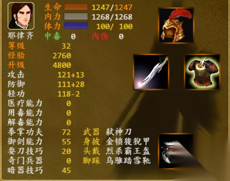 三、霸王套装 1、隐藏属性:100%内伤。 2、组成部位和获得方式:武器:杀神刀(吸血),当连城诀剧情进行到最后,在大轮寺大战血刀老祖(有几率获得,可以重复读档)衣服:金锁狻猊凯:在飞狐外传剧情中京城西郊打田归农(有几率获得,可以重复读档)也可以在孔八拉的第四项技能开启后可在主角家的后院进行打造。头盔:烈杀霸王盔,天龙八部剧情进行到雁门关击败契丹敌人后,在契丹王帐救耶律洪基(有几率获得,可以重复读档)鞋子:乌骓踏雪靴,阿丑的第五项技能开启后,在荆州商店的隐藏物品中购买。