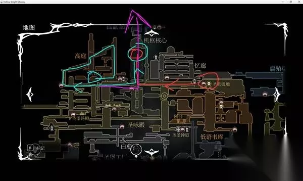 拿到飞针向右走回到电梯的地方,一路通过一段路之后拿到管理员的旋律,然后回书库交任务,然后从书库上面的隐藏回到圣歌盟地。(这个隐藏应该大家都知道就不放图了,反正有个歪着的梯子,打一下之后就能放下来,上去就是圣歌盟地)。 最后的路线就没什么好说的了,就是核心跳跳乐拿到建筑师旋律(最上面那个拼图解谜我记得好像是固定的,可以记一下每个每层打几下就行),然后高庭拿指挥家。高庭连战的战斗技巧我也没什么好说的因为我也是菜比死了好几次,我个人完全不会用弹反,前面小怪就用小白波清理一下,最后两个失败亚军的行动逻辑其实和1代骨钉兄弟会比较类似,不要被包在中间,不然会死的很惨(我一周目开荒时候这里直接拿钉子秒了一个的,现在只能靠技术之类的了)。