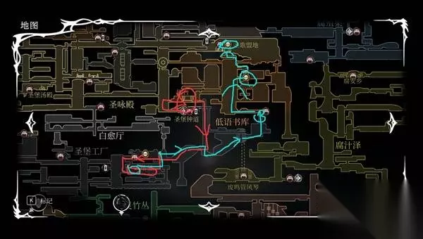 到达第二幕圣堡之后,路线其实相对就自由一些了,这里就说我个人的跑法: 首先上去先把机枢舞者打了(红色路线)