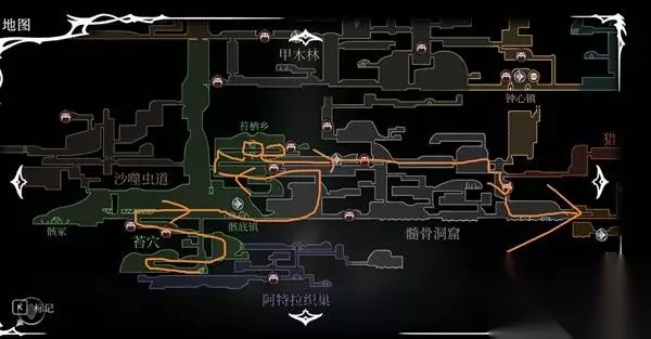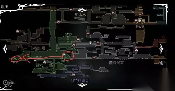 到钟心镇以后往左甲木林,到达那个初音未来一样绿的那个我圈起来的那个地方(下面那个),参考了世界纪录的速通视频,站在那里一直嘎啦吗就可以把上面的花的小怪引过来,这样就完成一个下劈skip,跳过修女直接拿爬墙,接着向右打黑寡妇,解放钟心镇。然后把车站和武器升级一下就行。