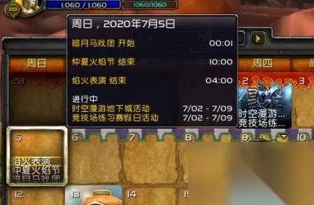 魔兽世界仲夏节篝火位置: 1.我们进入游戏之后,先看一下日历。 2.当我们的仲夏火焰节结束前的第二天,就可以开始看到焰火了。