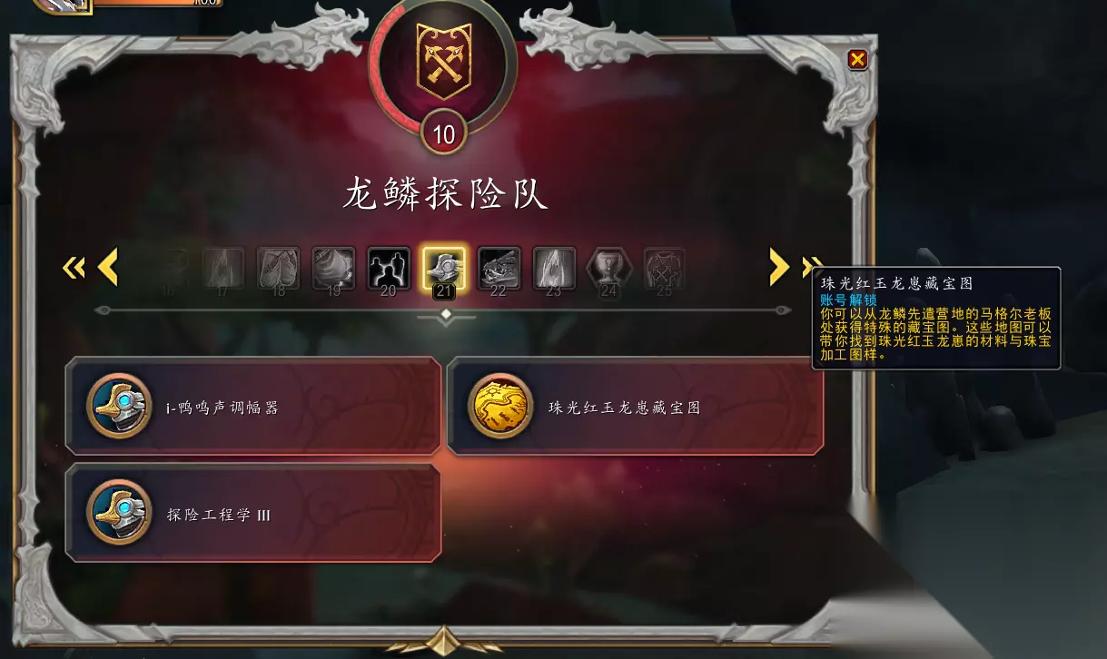 巨龙高脚杯复制品: 奖励玩具:金色巨龙高脚杯 需要购买考古学家神器笔记在地图上标记出位置 红玉宝石簇: 需要红玉宝石簇地图,地图可能和玛瑙宝石簇地图同一来源 亡者胸甲: /way 69.31 46.58 奖励幻化:亡者胸甲 塔内,中间位置,可以骑乘驭龙术坐骑从塔顶飞下来 迷雾宝箱: 气泡浮鱼: /way 40.45 41.36 奖励宠物:碧蓝褶鱼 需要稀有鱼类指南,该指南可在巨龙群岛野外翻动过的泥土(需要龙鳞探险队名望5购买小型探险锹)或探险队斥候的背包(需要龙鳞探险队名望2)中低几率找到,使用稀有鱼类指南可以在大地图上标记出气泡浮鱼宝藏的位置,到达位置,可以看到气泡浮鱼和一株芳香的植物,点击芳香的植物获取5分钟芳香的植物气味buff可以把气泡浮鱼吸引过来,然后与气泡浮鱼互动即可。 耶努的风筝: /way 46.71 31.21 奖励玩具:耶努的风筝 在树上挂着 破损的骑行背包: /way 48.49 85.16 奖励巨龙群岛补给 就在瀑布上方 玛瑙宝石簇: 需要龙鳞探险队名望21,在龙鳞先遣营地/way 46.96 82.89处的马格尔老板处购买玛瑙宝石簇地图,需要3个奈萨晶和100巨龙群岛补给