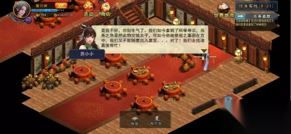 原来唐公子父亲是朝廷重臣,他的母亲思念成疾,撒手人寰。他化悲愤为动力,努力学习,争取考取功名。唐公子心里对他父亲更多的是恨,希望以后能化解吧。 事件③: 回醉仙楼找李墨墨,一番言语后,去调查谢贤。 谢贤不是什么好人,先去找西瓜王询问,然后得知他沉迷酒色,去丽春院找秋嫣姑娘帮忙。秋嫣姑娘给我要10万铜币,小钱,给她。然后等待10分钟,问秋嫣姑娘事情办的如何,谁知她竟然出卖了我!我还可怜你这风尘女子呢,唉,人各有志吧。然后和谢贤开始战斗。