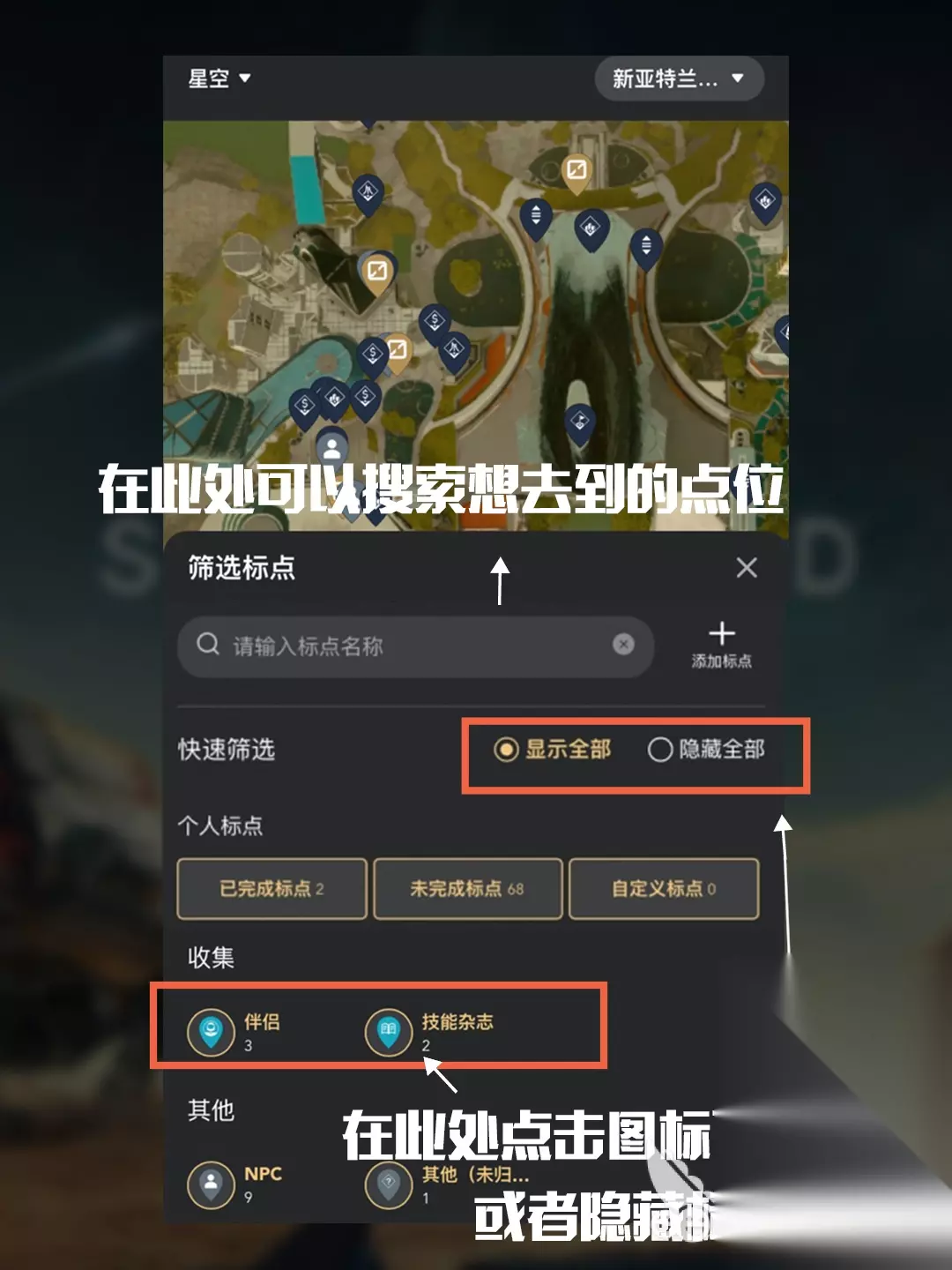 想找到其中具体的地图点位也可以直接打开左下角的筛选来进行搜索,游戏内的npc和其他功能点位是非常多的,而星空大地图功能中会将这些点位一一展现出来。