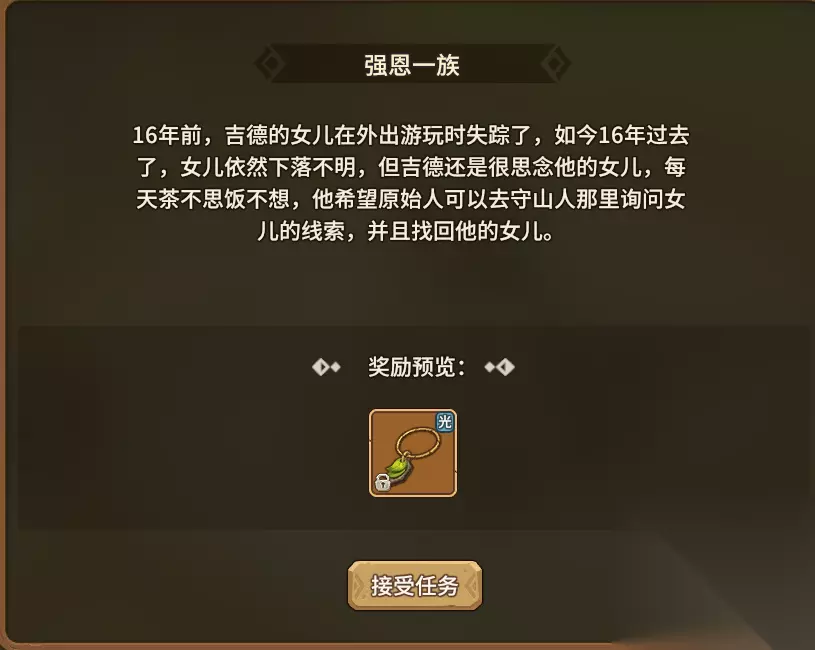 任务介绍 16年前,吉德的女儿在外出游玩时失踪了,如今16年过去了,女儿依然下落不明,但吉德还是很思念他的女儿,每天茶不思饭不想,他希望原始人可以去守山人那里询问女儿的线索,并且找回他的女儿。 任务奖励 强恩项链*1 在等级达到零转二十八级后,就可以接取该任务,首先要前往南岛,找到吉德的朋友与其对话了解吉德的情况;再与吉德对话替吉德寻找失踪的家人;将吉德的妻子和小女孩从卡克尔手中救下。