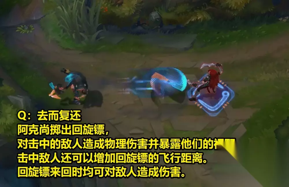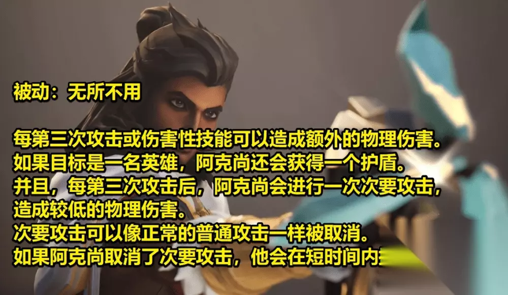 首先就是被动技能,总体来说还是比较简单的,属于英雄联盟中比较常见的“三环”,触发之后会造成额外伤害,如果目标是英雄的话,还可以给阿克尚提供护盾。如今暂时不知道这个效果有没有冷却时间,但可以肯定在对拼的时候将很强。 除此以外,触发“三环”效果之后,阿克尚还能够再进行一次攻击,但玩家可以自己决定是否取消。要是这次额外攻击取消了,那么新英雄会获得额外的移动速度。这个效果也同样提升了阿克尚的机动性,逃跑或者追击都很好用。
