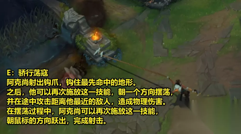E技能机动性超强 接下来就是E技能,有点类似于青钢影的钩索,但运动方式不太一样,是以钩索落点为中心进行圆型运动,玩家可以自由选择方向,在过程中也会对敌人造成攻击,再次施放的话则是会跃出去并且完成射击。 这个技能无疑是为阿克尚提供了超高的机动能力,而且操作上限非常高,如果这个英雄登上职业赛场,说不定会看到选手们凭借这个技能来疯狂秀对面。