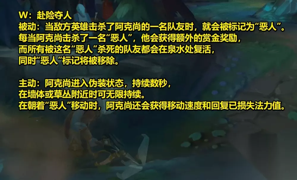 接下来就是机制最为离谱的W技能了,首先是主动效果可以让阿克尚进入到伪装效果,类似于老鼠的Q技能,在范围外的敌人会看不到阿克尚,但如果太过靠近的话则是会被发现。 而且这个技能如果是在草丛或者墙边,持续时间将会变成无限制,可以一直隐身下去。这也导致了这个技能相当离谱,在蹲人或这Gank的时候都会将对面打个措手不及。