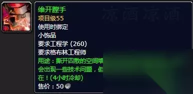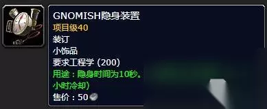 因为我这里是按橘黄色会+1熟练度、黄色70%会+1熟练度,绿色30%会+1熟练度来模拟的,而实际上稍微欧一点才能达到这个概率,像我这种非洲人即使是橘黄色也偶尔会不加熟练度,所以实际消耗的材料会比我这个模拟要多一些。 侏儒工程和地精工程 当你的角色等级超过30级、工程学熟练度达到200点之后,就可以在铁炉堡或者奥格瑞玛的工程训练师处选择加入侏儒工程或者地精工程。 选择合适的专精之后会签署一个保密协议,获得14天的会员卡,在14天内可以学习制作自己选择的工程的产物,而到期之后可以用2金币/14天的价格续费该会员卡,续费会员卡可以获得一个礼物包裹,开启一些工程学材料或产物。 下面是两种专精特有的值得关注的物品,因为很多东西在正式服已经被改过了,比如装备改成消耗品,所以我只能在外服数据库截图,机翻很渣但是还算能看懂。 侏儒工程特有的值得关注的物品: