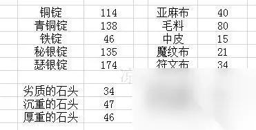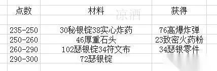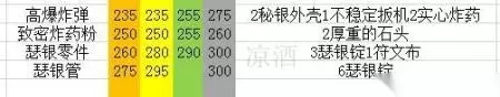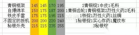 和之前的自爆绵羊一样,我们先做秘银外壳,然后做高爆炸弹到250点。这里我粗算了一下是做19个高爆炸弹从237-250,19个高爆炸弹需要38个秘银外壳和19个不稳定的扳机,上面我们做了28个秘银外壳,所以这里做10个,绿字按30%算所以我们从235-238,然后做19个高爆炸弹238-250。不稳定的扳机上面我们做了21个所以够了不再做。 250点学习致密炸药粉,一直做到260点变灰为止。260点做瑟银零件到290点变绿,做瑟银管冲10点。这个过程我们共用了: