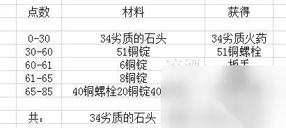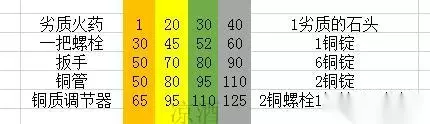 用劣质的石头做劣质的火药,一路做到30点,然后做一把螺栓做到60点,因为后面做很多物品都需要扳手,所以做一个扳手(61),因为此时铜管还是橘黄色,所以做4个铜管到65点学铜质调节器,做铜质调节器到85点,因为还是橘黄色,所以按20个算。 因为铜质调节器的铜螺栓我们之前做了51个,这里用40个,所以实际上我们: