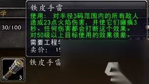 这个阶段我们需要做一些青铜框架,和上一阶段我们做过一些的青铜齿轮,保持这两个物品的数量一致,且可以做足够的自爆绵羊到175点。 我粗算了一下应该是需要15个自爆绵羊,即先做15个青铜框架到160点,然后再补8个青铜齿轮到161点,此时做15个自爆绵羊可以到176点。 到了175点就可以学习pvp神器铁皮手雷了,这个也是经典旧世名气的pvp物品,所以不怕做得多,可劲造就行。(正式服的图片,怀旧服没有等级要求)