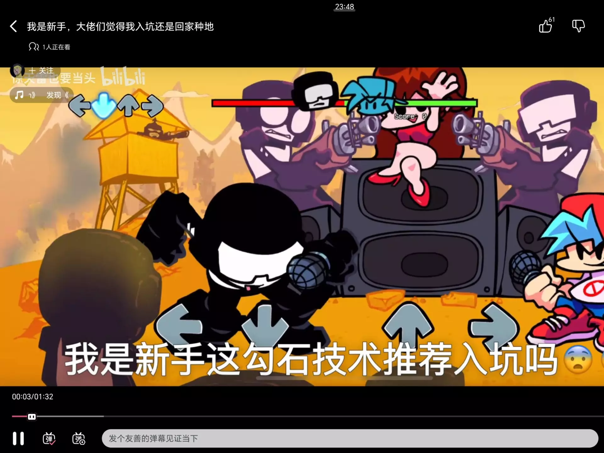 这是一则《周五夜放克》(FNF)的游戏游玩内容,展示了老弟游玩该游戏的画面,游戏开启了5倍加血、0.5倍扣血的设置,画面中呈现了游戏的操作箭头、角色以及游玩数据等内容。
