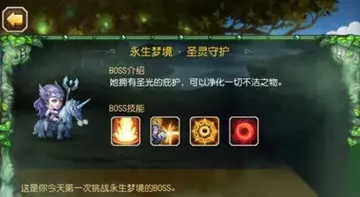 小冰冰传奇永生梦境圣灵守护技能: 小冰冰传奇圣灵守护介绍:她拥有圣光的庇护,可以净化一切不洁之物! 小冰冰传奇圣灵守护技能有4个,从技能图标来看,好像都非常碉堡了,如果没猜错的话第一个技能应该是火系输出技能,第二个应该是像光法大招一样的东西,第三个就是他的驱除buff的技能,第四个应该是伤害叠加的技能,至于详情是什么,后续更新。 小冰冰传奇永生梦境圣灵守护怎么打? 我们都知道这个BOSS主要是靠它的圣光技能做筹码,所以我们一般都是等他的大招技能失效后再放大招,或者是使用致盲等技能让BOSS尽可能多的miss,才有可能打出高伤害,当然了,具体的阵容,大家可以参考之前永生梦境BOSS的阵容。 小冰冰传奇圣灵守护平民阵容: 死亡先知+小黑+修补匠+猴子+术士,备选英雄有潮汐、小小、大树、蓝胖、机甲浣熊(这个可以公会租用),还有小鹿等英雄。