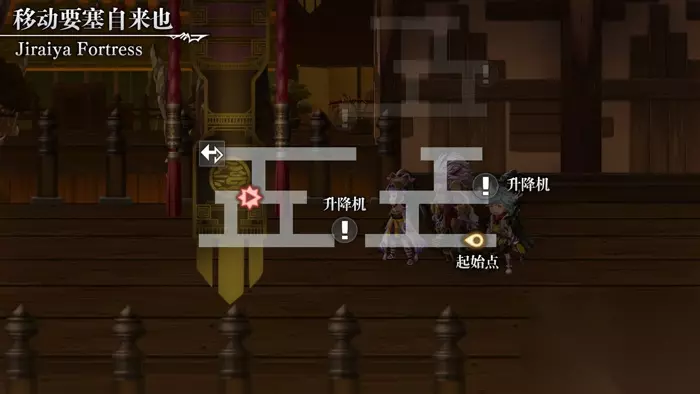 时之女神教会 1、返回“巳之国伊刹那”。 巳之国伊刹那 1、进入地图后直接触发剧情,被传送到“移动要塞自来也”。 移动要塞自来也(下层) 本场景每个区域有上下两层,需要通过升降机移动。 本场景流程较长,中途没有回复点,建议通关后再返回探索宝箱。 攻略地图内的升降机已不是初始状态,仅作示意升降机位置,请按照文字描述行动。 区域1