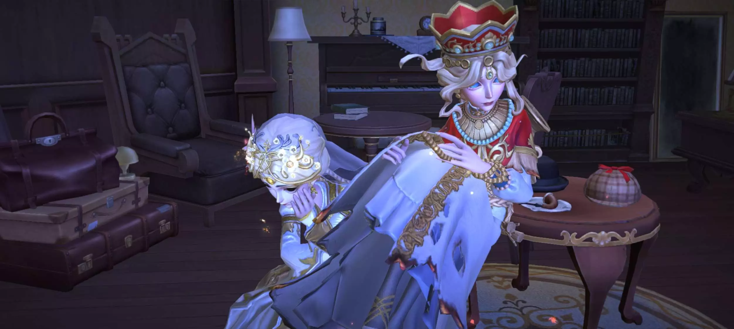 第五不是出了一个监管和求生都能蹲那个动作嘛,然后那时候我随便问了一下,然后我那个朋友说要跟我拍个照片我和他都拍了之后,我一看渔女的眼睛真的很泪汪汪诶,好可怜的样子而且蝶宝在看什么呢?