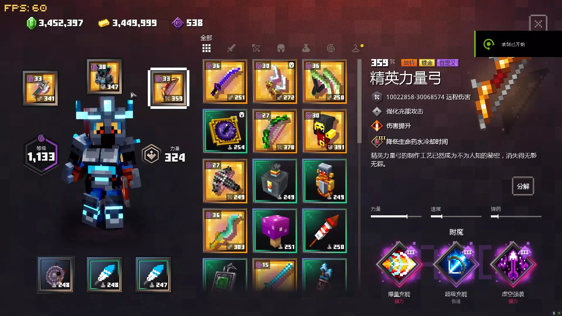这是沙盒游戏《我的世界地下城》的游戏内容展示,玩家在末日25难度的蘑菇岛关卡中,凭借附魔了超级充能的精英力量弓,成功杀穿该关卡,展示了高伤害的战斗过程。
