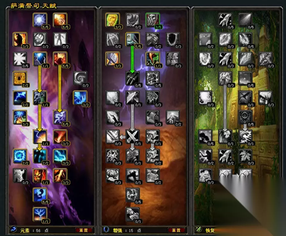 首先讲天赋,个人推荐前期使用56-15-0的天赋点法,增强系点出元素武器和萨满专注,元素系56点覆盖所有增伤天赋。这套天赋新手朋友可以直接抄作业,没毛病。