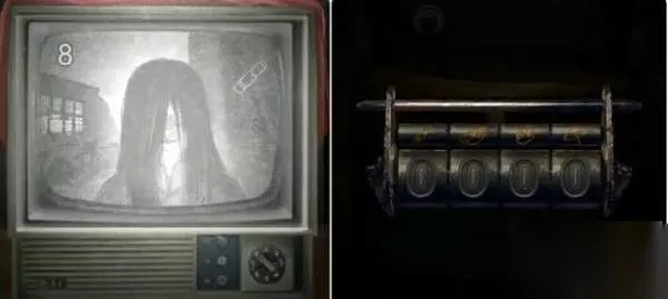 4.回到堂屋点击电视柜先用胶布修复电视机的电源插头,然后将插头插入插座。接着观察下面抽屉上的铜锁,再点击电视机观察出现女鬼的频道即可获得密码「8725」。