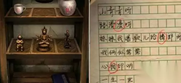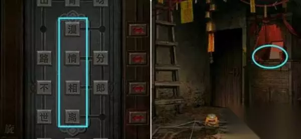 8.点击地下室入口根据作文纸上画红圈的提示调整机关打开木门,即中间四字为「漫情相离」。接着进入地下室拿走神龛上的「剃须刀」,然后到灶台前用其打开橱柜最下面的柜子获得「口红」。
