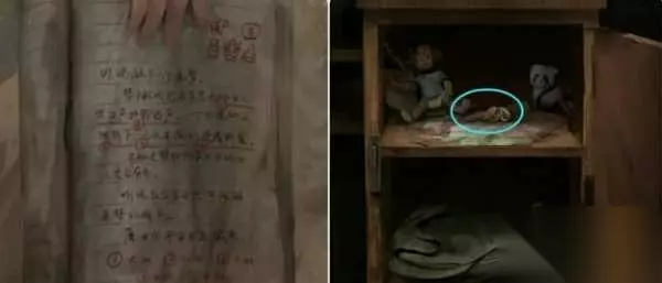 6.日记本干了之后到堂屋的镜子前(电视机右边)观察日记本上的提示,然后根据提示(大凶小凶大凶大凶中凶)打开右边的柜子获得「钥匙」,接着用其打开橱柜左边的木门。ps:笔记本右上方的图案为后续解谜提示,记住它们的位置。