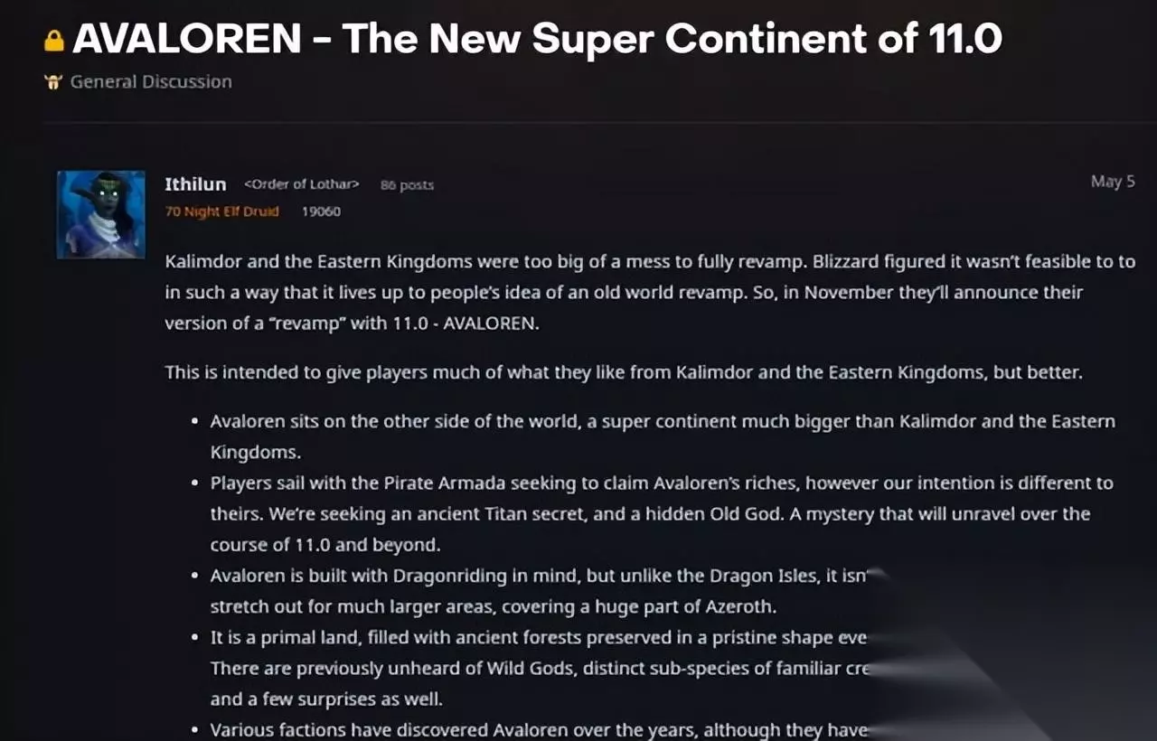 已经有多家媒体,或者舅舅党玩家爆料暴雪可能已经在着手开发这个资料片,它可能会包括以下内容: 阿瓦隆也可以使用驭龙,并且可以飞行的范围大大增加。 这是一片原始的土地,到处都是古老的森林,自桑德林之前就以原始形状保存下来。有以前闻所未闻的野生神灵,像地精和精灵这样熟悉的生物的不同亚种,还有一些惊喜。 多年来,各个派系都发现了阿瓦洛伦,尽管他们还没有征服所有的地方。例如,血色十字军重新定居并在其西岸建立了血色王国,这是一个狂热的国家,致力于将当地居民转变为光明阵营。 自桑德林以来,也有人居住在这里,几千年前与他们的亲属分离。例如,具有新型德鲁伊形态的暗夜精灵社会和森林巨魔。 阿瓦隆设有玩家的住房。玩家可以从几十个潜在的地点中进行选择,并在他们喜欢的风景中建立自己的住所。然后,这所房子可以升级和定制,并获得一个特殊的炉石传说背景。 阿瓦洛伦拥有多个生物群落和丰富的景观,从沙质沙漠到热带丛林、茂密的森林、雪山和草地。这是一个全新的世界。