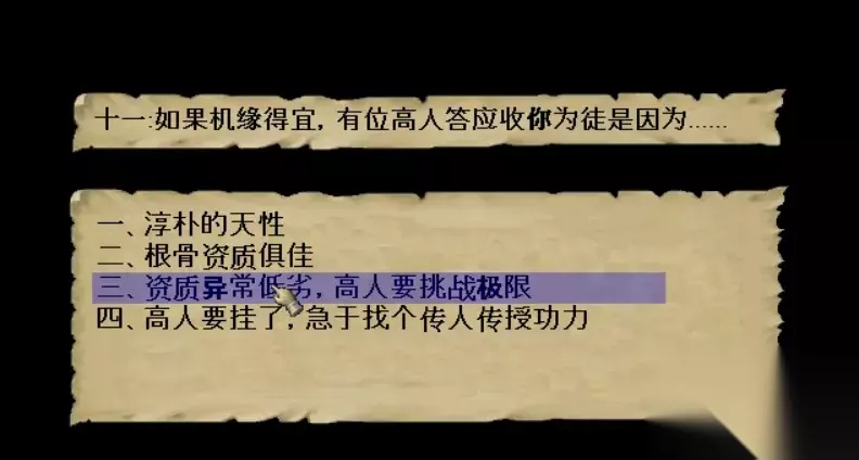 最开始,我们在进入这个关卡之前就要先做好准备,因为关卡属性的问题,所以我们需要最开始将福缘的属性点,往上加,最好加高一点,这是小编过关多次得出的经验,加到合适的数值后,我们就开始继续走剧情,我们会不停的回答问题,前十个问题比较简单,就算算的不一样,也没有多大的影响,所以不用管,但在回答第十一个问题的时候,在选项中要选择资质低劣这个选项,选择这个的原因是能加福缘值点,这样加上刚开始的福缘值点,就已经几乎大于八十了,这样的值点已经很高了,不需要再为这个多费心了,之后我们就需要将点,加到我们的悟性上面,同样重要的还有灵敏。