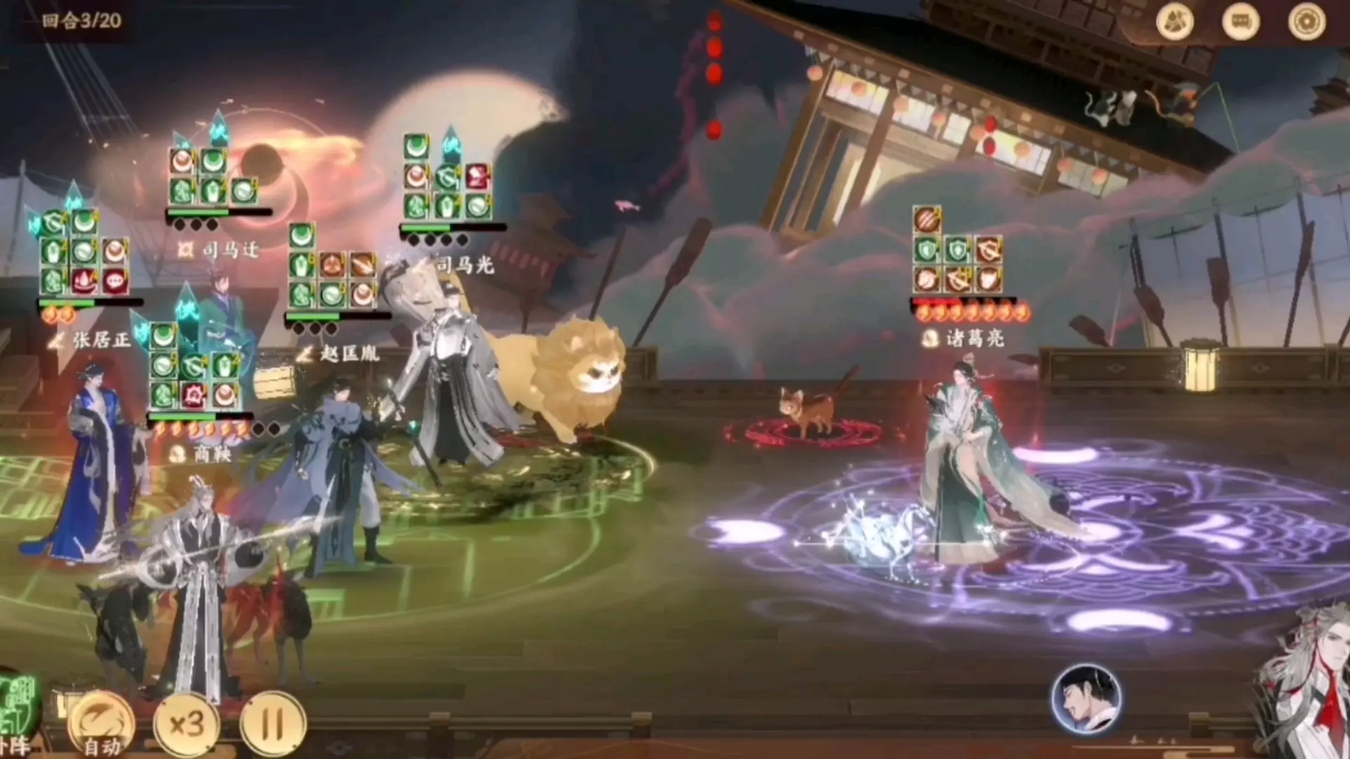 这是《忘川风华录》的对战内容,展示了以岳飞、于谦为核心的阵容在回合对战中打出高额伤害,实现逆风翻盘的对战过程,呈现了精彩的技能释放与阵容配合。