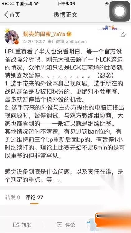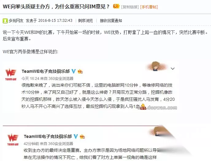 最重要的是这局OMG开局是大优势,重赛会非常影响队友的情绪和心态。 对比赛的结果是有影响的。 这种选手自带外设出现故障的问题,不是应该暂停立即更换官方设备? 有必要调试2个小时多? 而且在比赛开始之前,IM官方发了微博,说设备调试完毕,准备开始比赛了! 出事之后,IM居然把这个微博删除了!让人觉得很心虚! 而且IM战队重赛事件,不止这一次! 不单说他们还曾经叫EDE的时候在LSPL多次重赛, 在和YM的升降级BO5比赛中,也是暂停比赛最后翻盘。 进入LPL以后,和WE也是曾闹了一次不愉快的重赛风波: