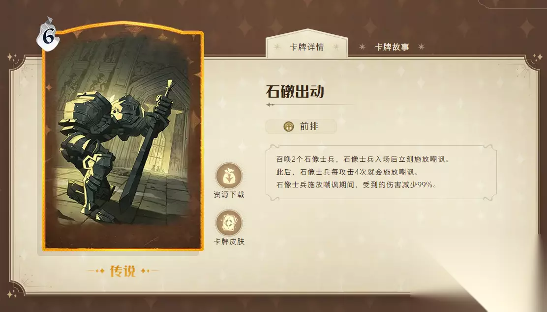 “石礅出动”也是召唤卡里很契合海格的法术,虽然费用偏高,但是成功召唤出来之后两个石像都能吃到攻速加成,还能产生嘲讽效果增加海格的生存能力。在嘲讽期间能免疫几乎所有的伤害,方便海格使用法术输出,能克制一些召唤流的卡组。而且搭配回响的回血效果能让它们在站场上存活很久,整体的坦度和伤害都很优秀。
