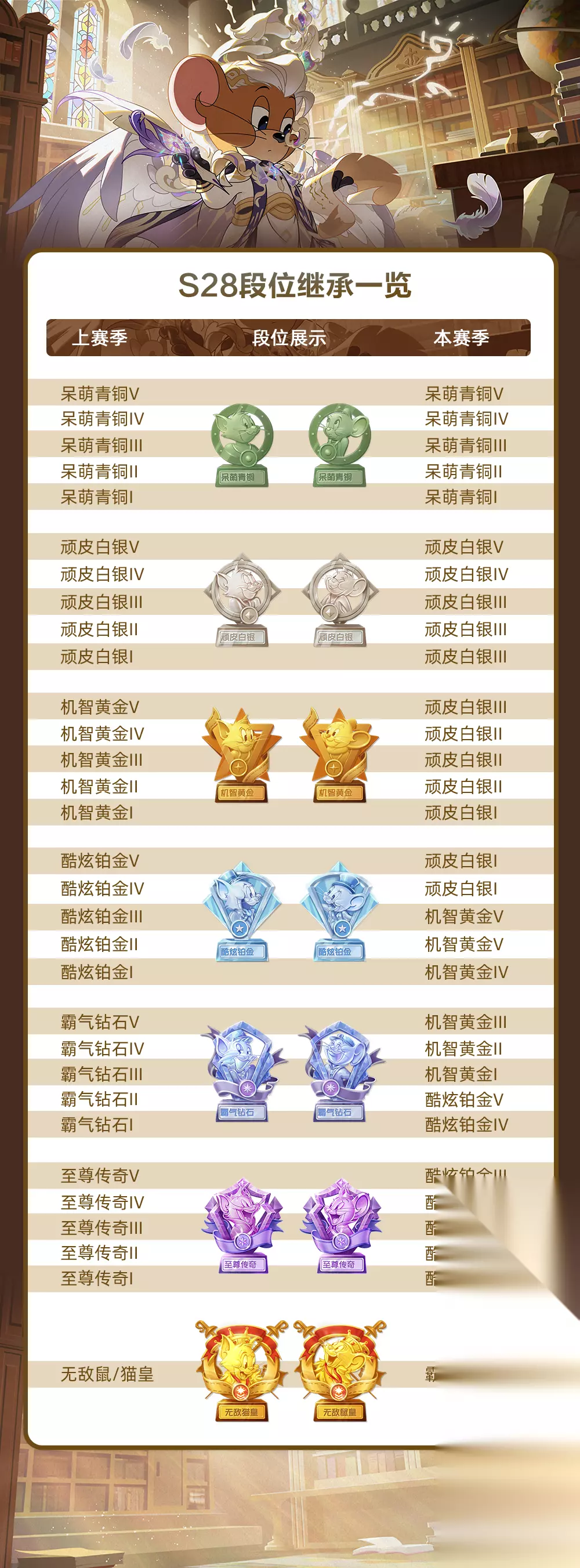 赛季更替的重要提醒 随着S27赛季的即将结束,在S28赛季即将到来之际,有几件比较重要的事情,小不点需要提醒大家哦。 1. S28赛季扫货通行证即将开始 2026年4月3日将会开启全新的S28赛季,届时扫货通行证每日任务、每周任务会重新刷新; 进入S28赛季后,S27赛季中为您保存的扫货币将清空,同时,货架将上架为S28赛季的奖励,请您记得及时领取属于您的S27赛季奖励、将您的扫货币在兑换商城中使用完毕。 2. S28赛季竞赛模式 *S28赛季竞赛模式,通行证大师奖励只保留称号奖励,其他奖励均修改为到达指定等级即可获取; *本期通行证染色皮肤为:天使杰瑞·宫廷神官·翡冷翠、仙女鼠·宫廷典礼官·翡冷翠及莱特宁·宫廷传令官·翡冷翠。 3. S28赛季天梯赛段位继承 “2026年4月3日S28赛季”开启后,将会根据继承规则对玩家“S27赛季”的段位进行降级继承,具体继承规则详情可前往游戏内精灵或官方平台查询; 赛季切换时,天梯将暂时关闭,关闭时间为赛季切换前后的3小时。