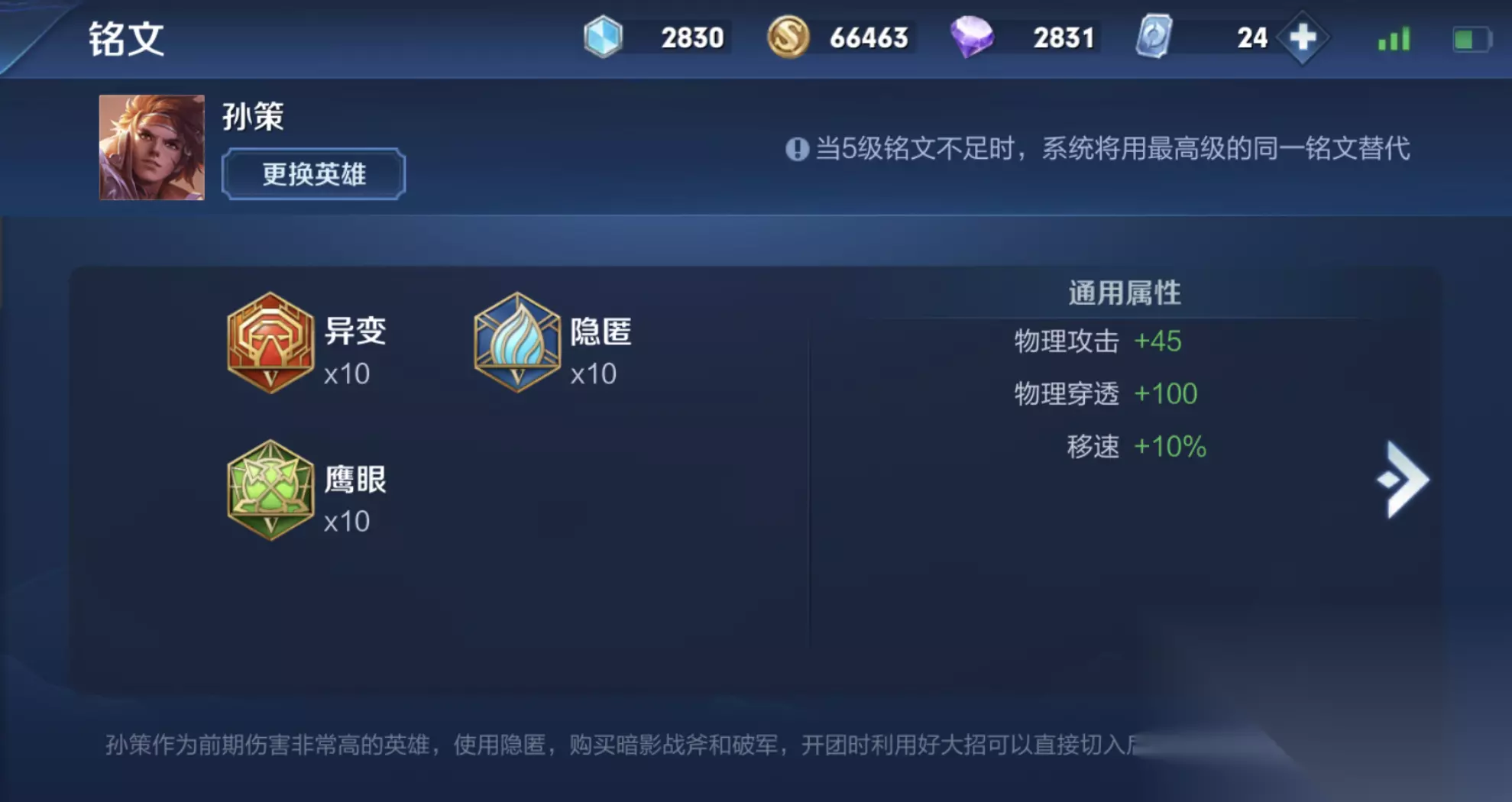 游戏中期通常需要做出破军来显著提升对残血目标的收割能力。后续装备需根据局势灵活选择,常见方案包括名刀·司命用于自保,或碎星锤针对高护甲敌人。若团队需要前排承伤,也可以转而出魔女斗篷、不祥征兆或反伤刺甲等防御装。铭文搭配则以经典的百穿组合为基础,推荐10个隐匿、10个鹰眼、10个异变,力求最大化前期伤害与物理穿透。追求暴击概率的玩家可将1个异变换为祸源。这套配置奠定了孙策打野所需的基础属性框架。