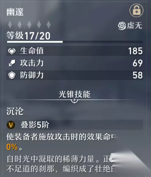 如果是前期小伙伴们没有足够的货币去抽取更好的武器,那么极其容易获取的三星武器幽邃就是小伙伴们的第一首选,同样是虚无属性的武器,17级的属性就能够给银狼加成185点的生命,69点的攻击和58点的防御力,基础属性十分强大,最重要的是武器自带的技能“沉沦”,能够让银狼释放攻击时,效果命中提高40%,极大程度的提高了银狼的辅助能力。