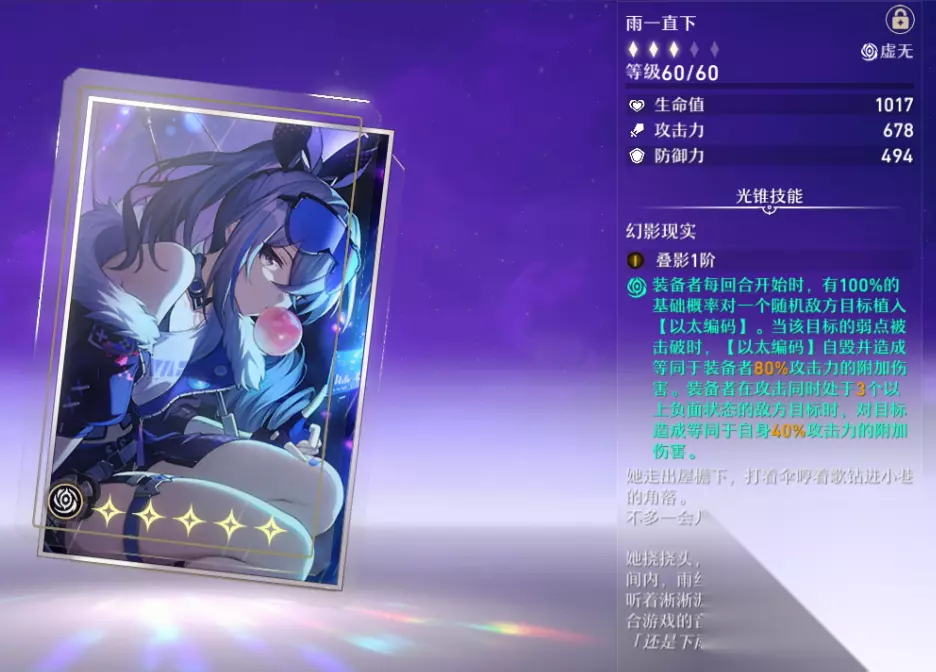 到了后期,如果想让银狼能够迎来一次质的飞升,那么“雨一直下”这件武器就能够轻松达到这个目标,满级的雨一直下能够给银狼带来1017点的生命值、678点的攻击和494点的防御力提升,最重要的是这件武器的自带技能“幻影现实”,作为银狼的专属武器,在战斗开始前就能有100%的几率对随机一个敌人植入“以太编码”,只要该目标被击破弱点,编码就能够自毁并造成银狼80%攻击力的附伤,同时攻击三个以上的负面状态的敌人是,还能够附加40%银狼攻击力的伤害,这样既能提升银狼的基础属性,又能让银狼在辅助的同时打出高额的伤害,是最适合银狼的武器没有之一。