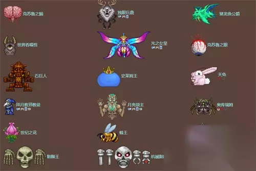 8、双子魔眼/毁灭者/机械骷髅王(三王都要打完才会有概率生成世纪花孢) 9、世纪之花 10、石巨人 11、光之女皇 12、猪龙鱼公爵 13、拜月教徒 14、日耀柱/星璇柱/星云柱/星尘柱 15、月亮领主 总而言之,游戏中各个不同的BOSS强度都有所不同,大家可以参考小编的攻略,去游戏中由弱到强的刷BOSS,新手玩家可以多看一看。