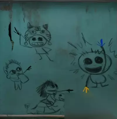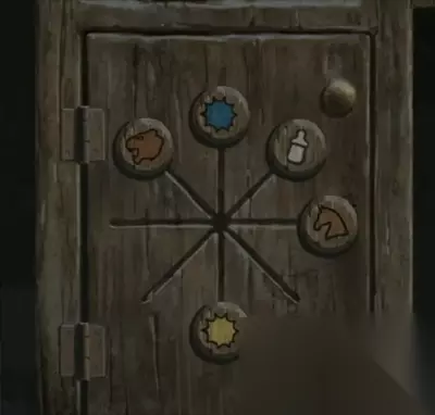 再查看一下左边的柜子,图案刚好对应我们黑板上的图案,调整【虎头↖】【奶瓶↗】【木马→】【蓝色↑】【黄色↓】打开下面的柜子,拿到一个【剪纸小人】和一面【锦旗】,剪纸小人的姿势看起来有点眼熟,不就是安全通道的那个跑步小人吗?出来,走廊触发老奶奶剧情,这奶奶一看就是言她的盲奶奶吧!后面还没玩不确定哦。